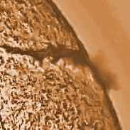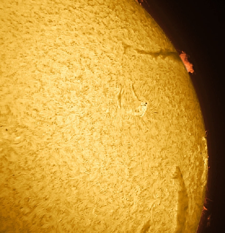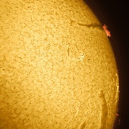 Part of the large filament in the Northern hemisphere has rotated over the limb. When this occurs we see a prominence. Images captured with a 40mm PST, a 1.5X Barlow and a DMK41 camera.