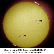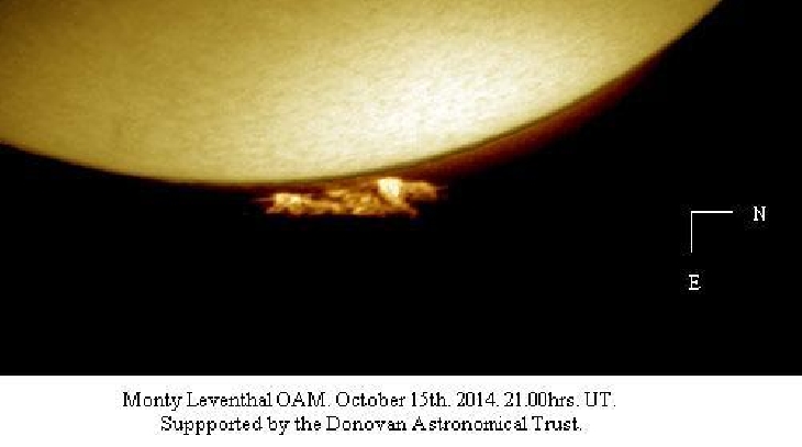 These digital filtergrams of the 15th shows a suspended Hedgerow Prominence reaching an approximate height of 84,000km and 214,000km wide. Date:- 15-10-14 Time:- 21.00hrs UT Conditions:- (3) Fair Camera:- Canon EOS 600D ISO:- 400 Shutter speed:- Full disc, 1/60 sec. Partial disc, 1/13 sec. Filter:- H-alpha 6Å Telescope:- Meade S.C. 10 inch for partial disc & Solaris telescope for full disc.