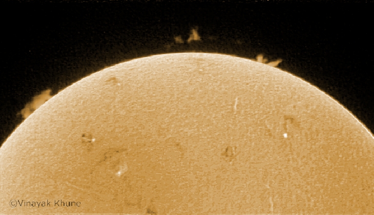 A nice detached prominence on Sun's eastern limb. Seeing was extremely bad since it was captured just an hour before sunset at 16:45 IST (UT+5.5).