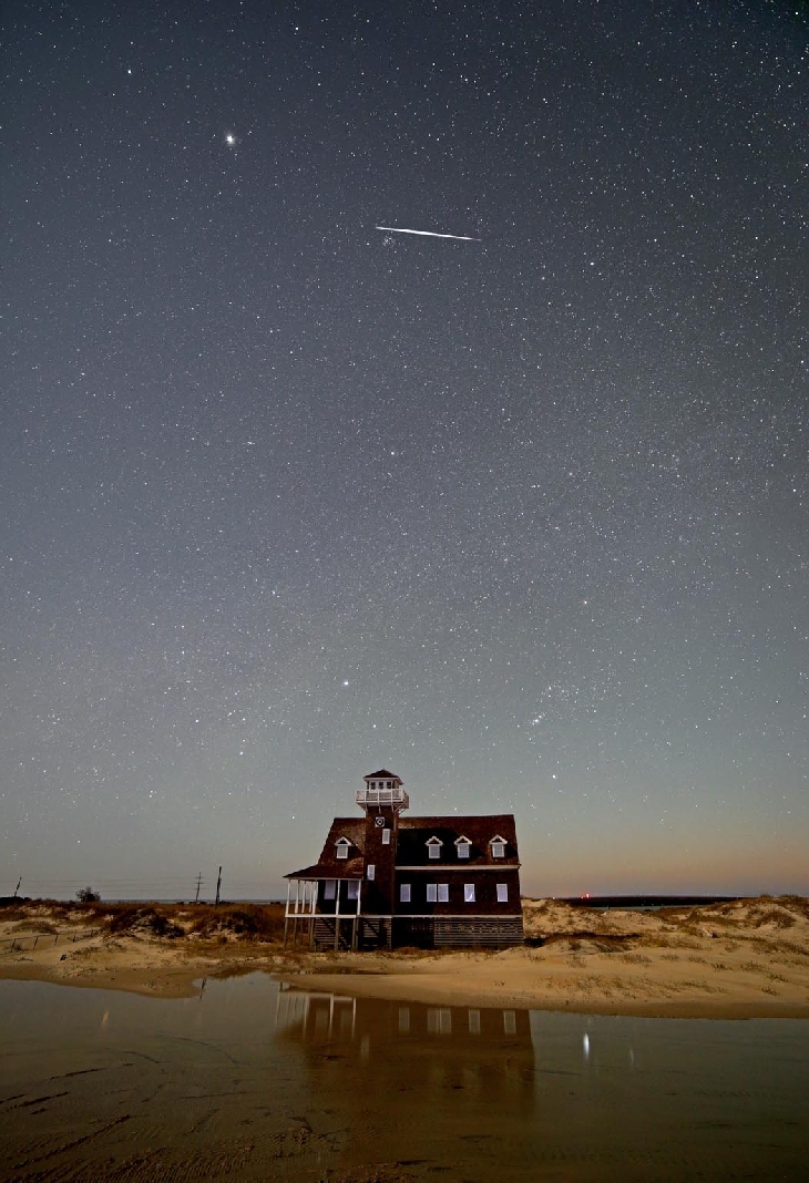 This was the night after the peak, but I did manage a nice fireball over the Oregon Inlet Life Saving Station. Canon 6D, 14mm lens, f4, composite image, ISO 6400 for meteor and 800 for background.