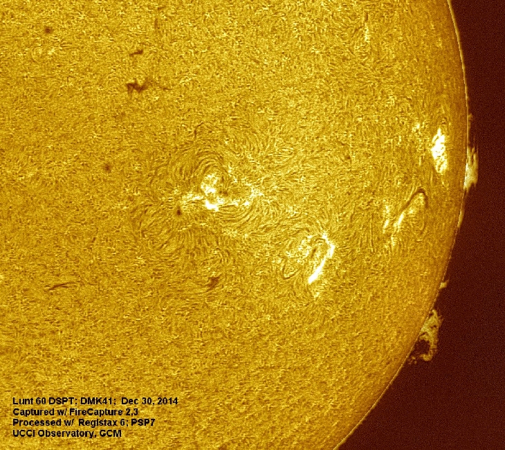A variety of solar features. Lunt 60 DSPT; FireCapture 2.3; Registax 6; PSP7. East/West reversed. For best image, double click for enlarged window.