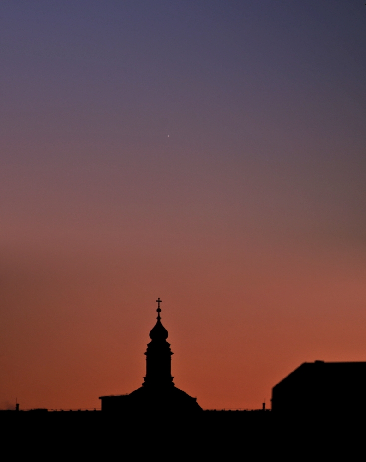 Very clear air conditions this evening allowed me to capture Venus and Mercury setting over st. Anne's chapel. Although the tighest conjunction is yet to come, the view was very pleasing to the eye. --- EOS 6D + Sigma 70-300 lens, ISO 100, f/7.1, 1/6 s.