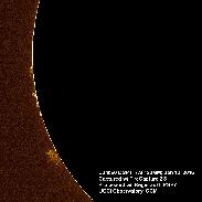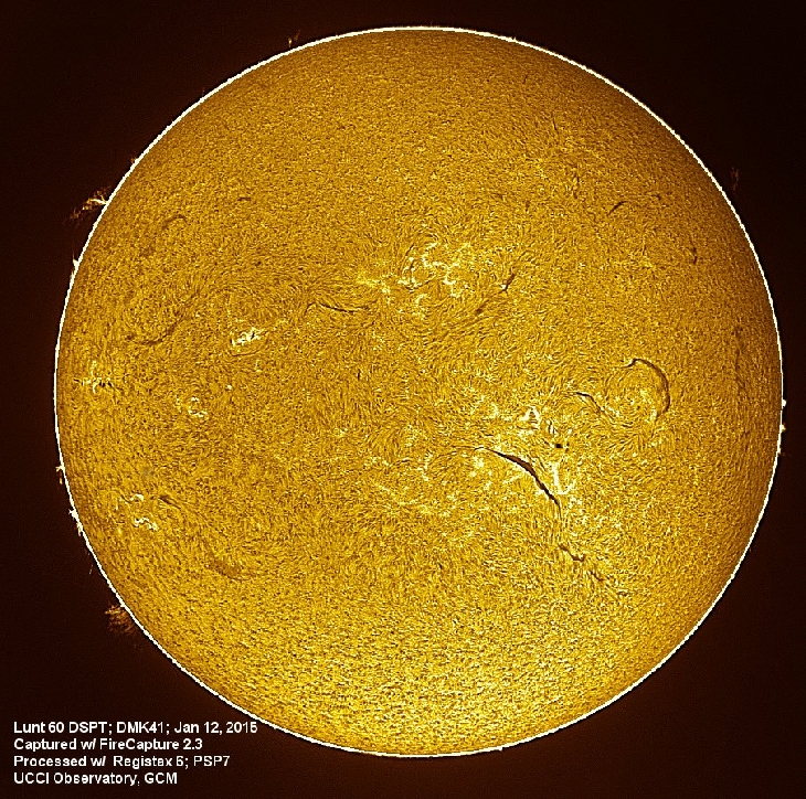 Many interesting features in today's sun - prominences, sunspots and filaments. Lunt60 DSPT; DMK41/ASI120MM; FireCapture 2.3; Registax 6; PSP7. East/West reversed. Best viewed in enlarged window.
