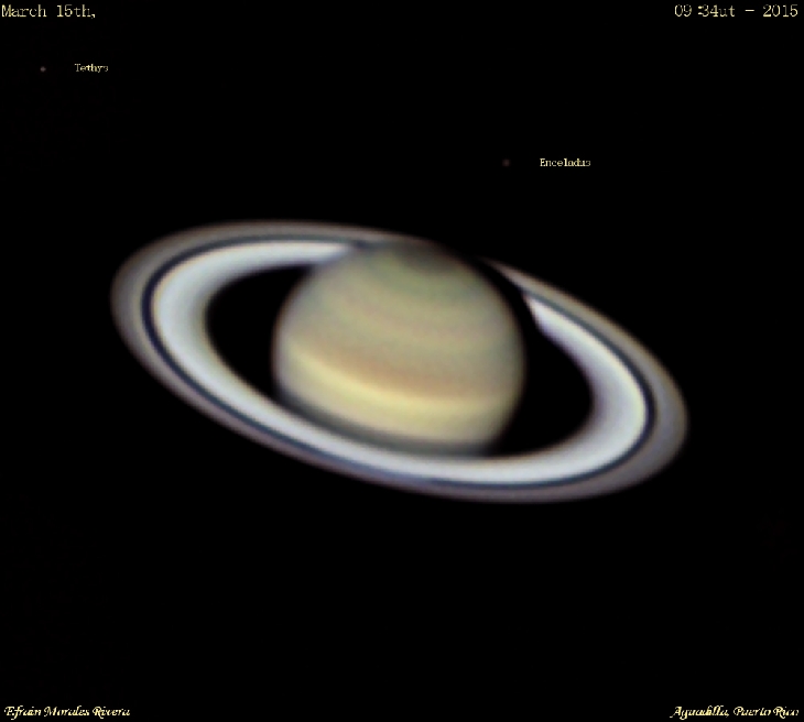 Saturn and the moons Tethys (top-left) and Enceladus (top-right) on March 15th, 09:34ut. Under slightly better conditions from my last session. Now within two months from opposition.