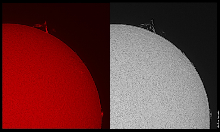 An interesting event took place on the Sun yesterday (23rd March) at 3.56pm Australian EST (5.56am UT). There was quite a large spindly prominence ejecting from the south-western limb of the Sun. So I quickly took some colour images and by the time that I changed the setting to take some monochrome images at 4.07pm, the shape of the prominence had changed quite dramatically…in just 10 minutes! I wanted to capture a close up of the ejecting plasma, so I quickly took the camera off the telescope to add a higher magnifying barlow lens, but when I looked again at 4.19pm it had completely evaporated…the whole prominence had just completely disappeared! Now I asked myself, how could that happen? Perhaps the prominence was on the cusp of the limb and it just rotated out of view, or perhaps it was just very rarefied and it just disappears into space? Whatever the answer…it was just awesome to watch :-) My images were taken with a Lund 80mm solar telescope and a Canon 700D SLR camera with a 2x Barlow lens. The colour image is a composite of two images, one for the solar surface and the other image for the fainter prominences; the monochrome image is not a composite. There were 30 images each fired off in rapid mode and stacked in RegiStack6 and processed in PS. (East is to the top of image and West to the bottom)