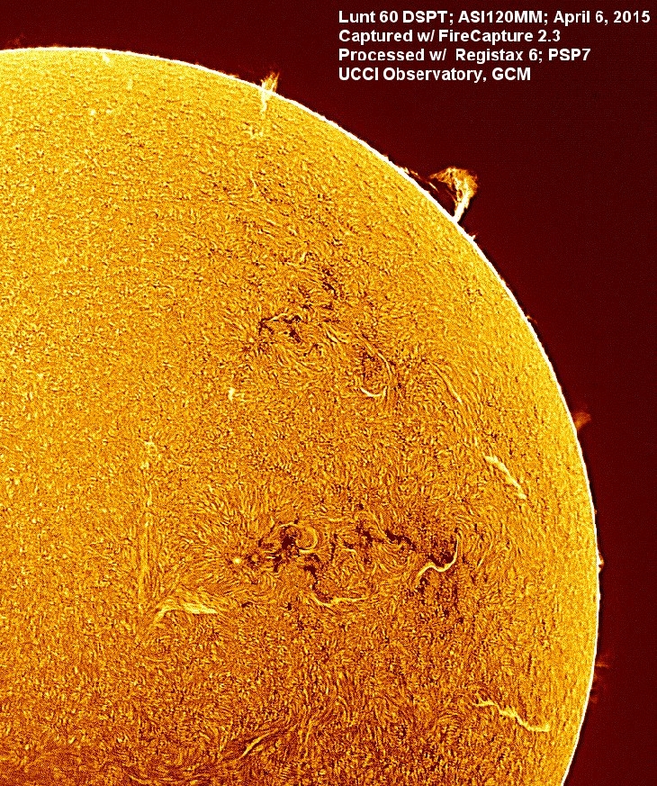 Still worthwhile solar features to image. Lunt 60 DSPT; FireCapture 2.3; Registax 6; PSP7. East/West reversed.