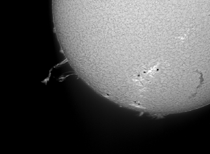 A DMK camera was attached to a Solarmax 60 BF15 H-alpha scope on a Merlin AZ mount. Two AVIs were captured of 1500 frames at 60fps. One AVI exposed for the prominences and one exposed for the disk. The AVIs were stacked and wavelet processed in Registax 5 and the two resulting images combined in Photoshop.