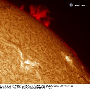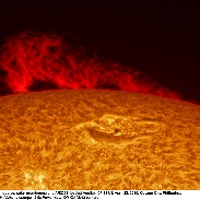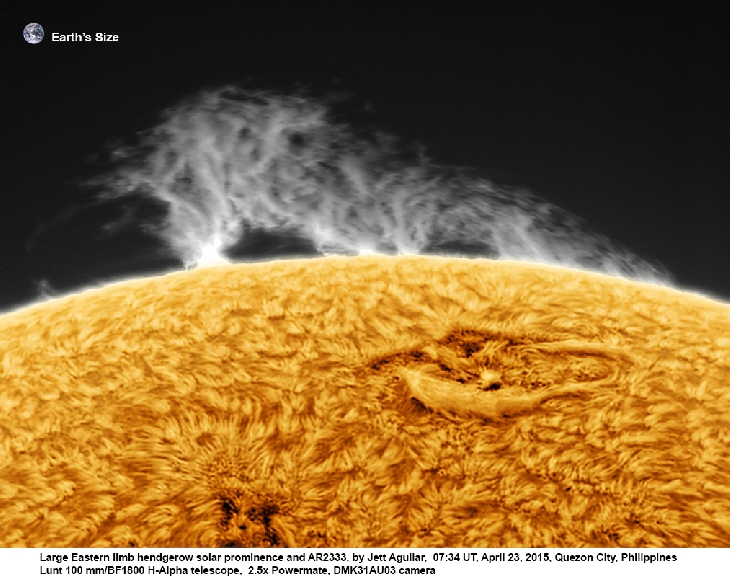 This late afternoon at my place in Quezon City, Philippines, I was lucky enough to get a break in the clouds to observe and image the huge beautiful caterpillar like hedgerow prominence at the NE limb. There was also another smaller prominence at the NW limb.I used a Lunt 100 mm/BF 1800 H-alpha solarscope.
