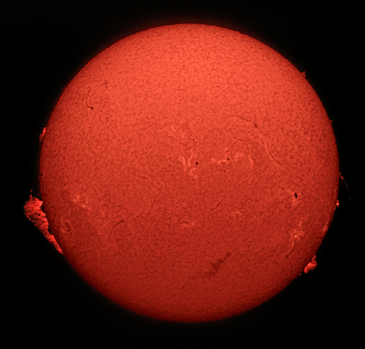 Whole disk H-alpha imaging imaging with a Solarmax ll 60 Bf15 H-alpha scope and an Opticstar PL-130M monochrome CMOS camera. Two AVIs were captured. One exposed for the disk and the second exposed for the prominences. The two resulting images were combined in Photoshop.