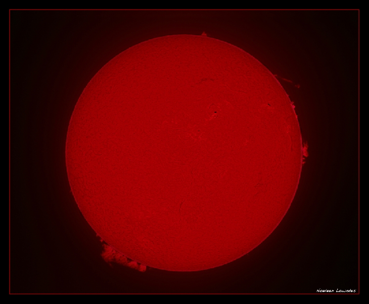 The H-alpha images were taken with a Lunt 80mm solar telescope and a Canon 700D camera. The colour image is a composite of two images, one to capture the solar disc and the other one to capture the faint prominences. The monochrome image is one set of images stacked in Registack6 and lightly processed in PS CS4.