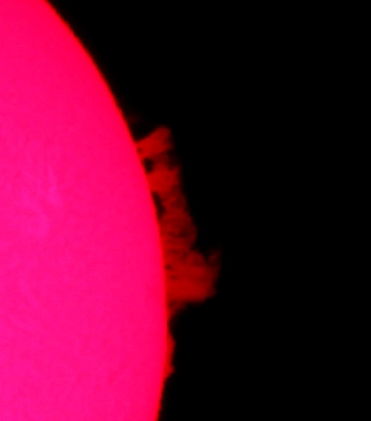 Biggest prominence I have seen. Lunt 35 Ha scope. 1/400 second at asa 800. Prime focus with Barlow at about 1.25x.