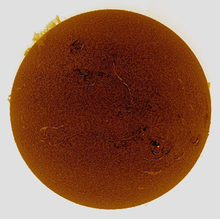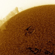 The large prominence is still dominating the sun. Now with a filaprom attached at one end. Details: Coronado DS SM90 Etalons+William Optics FLT98+BF30+Zwo ASI174MM video camera (150/3000frames stacked).
