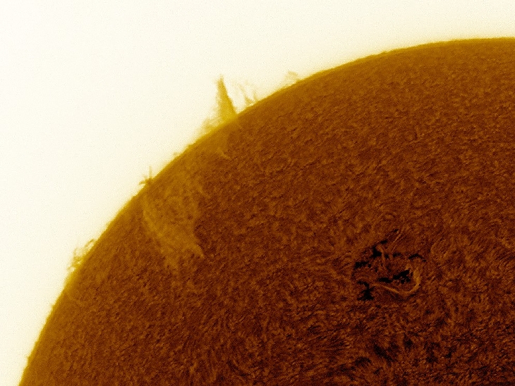 What a difference a day makes as the giant filaprom has changed in size and shape. Details: DS SM90,AutoStakkert, RegiStax and CS6.