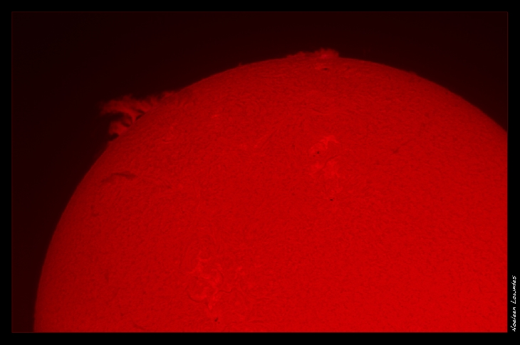 My images were taken with a Canon 700D camera with a 2x and 3x barlow lens attached to a Lunt 80mm solar telescope. The colour image is a composite of two sets of images one for the solar disc and one for the faint prominences that were stacked in Registack6 and combined in PS CS4. The monochrome image is not a composite; it shows a little bit more of the faint detail in the gaseous plasma of the prominence :-)