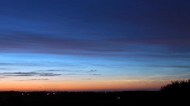 The first clear display of noctilucent clouds, from Denmark 2015. A faint display was visible a few days ago. See the time-lapse video here: https://youtu.be/1mI-xCgf9Mg