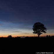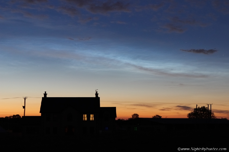 A nice showing of Noctilucent Clouds manifested in the skies over N. Ireland before 01.00 UT last night spanning 120 degrees of sky. Although the display was subtle and of type 3 brightness it still was a pleasant sight in the form of silvery-blue ghostly apparitions of veil and banded structures against the twilight summer sky complimented by an isolated house in the Maghera countryside in the foreground. I eagerly await the complex displays which will no doubt appear in our skies soon. Canon 600D 24-70mm F/2.8 lens.