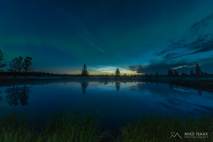 What a night, I missed the strong aurora show but the noctilucent clouds were equally as strong! Took my headlamp and reflected it off my jacket to light up the grass in the foreground.