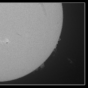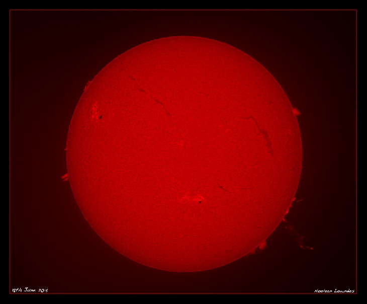 I used a Canon 700D camera and a Lunt 80mm solar telescope with a 2x and a 3x barlow lens attached. The colour image is a composite, one set of images for the disc and one set for the faint prominences, which needs a longer exposure to capture; images were then combined in PS CS4.