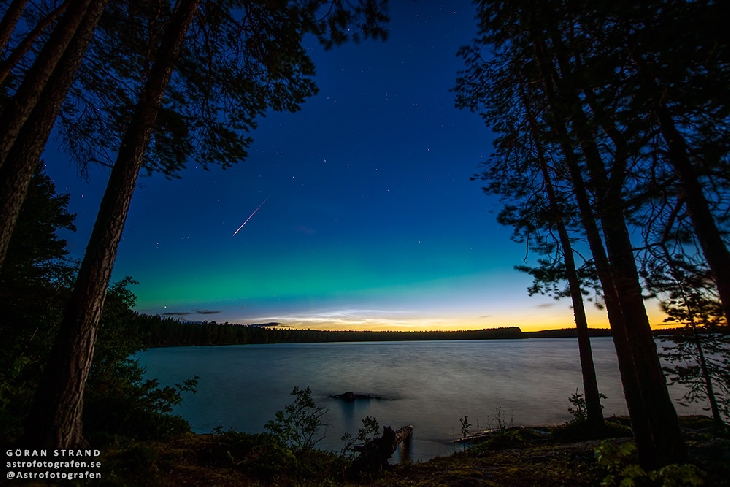 This is a shot showing three very beautiful phenomena, aurora, Noctilucent clouds and a bright Perseid.