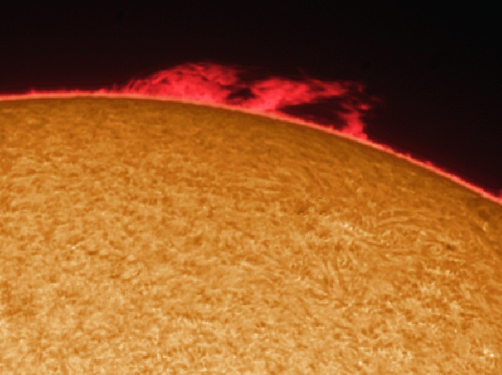 Solar prominence captured this afternoon at 1809 GMT. Lunt LS50 solar filter with B1200 blocking filter on a Borg 76ED scope. Takahashi EM200 mount Imaging Source DMK 21AU04.AS camera and Celestron Ultima Barlow 150 frames aligned and stacked in Registax Finished in Photoshop