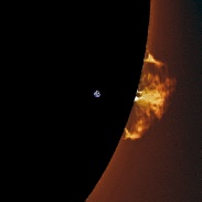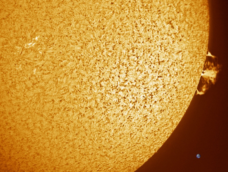 A very nice and large prominence appeared on the Western limb today. I captured it with my 40mm PST, a 1.5X Barlow and a DMK41 camera. An approximate size of the Earth is inserted for a comparison.