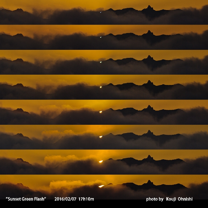 I was shooting the sunset of the green flash. Shooting location altitude is 1600m, the temperature is minus 10 degrees, elevation of the position that sank the sun is 3000m, Mt Yarigatake, a Japanese Northern Alps, 80km distance from Sugadaira-Highlands.