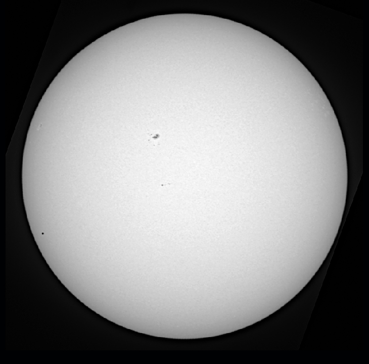 ... nice to see an active region and Mercury. Galileo demonstrated that sunspots were, in fact, on the sun; sunspots foreshorten when near the sun's limb, and transiting objects (Venus and Mercury) maintain their size and shape as they pass in front of our sun.