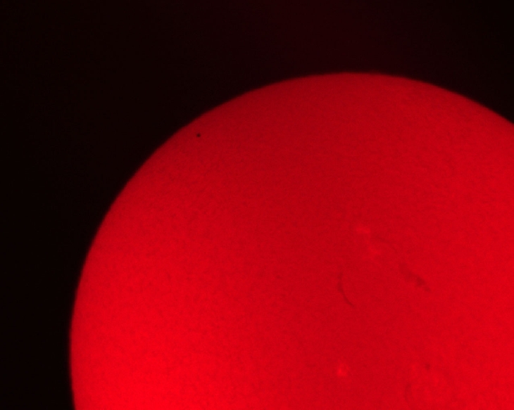 Mostly clear sky Captured with Mallincam SSIc and Lunt 80mm double stacked H Alpha solar scope at 11:28 PST near end of transit