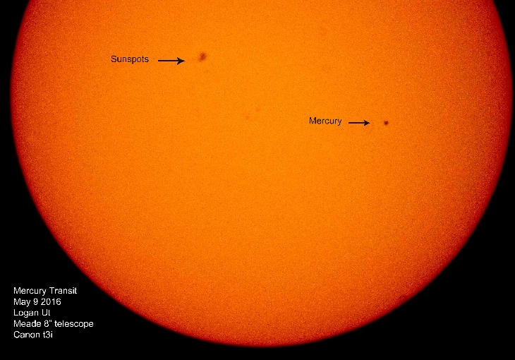 Mercury transits the sun. Meade 8 inch, solar filter and Canon T3i.