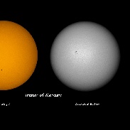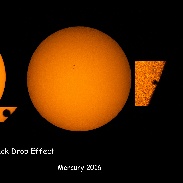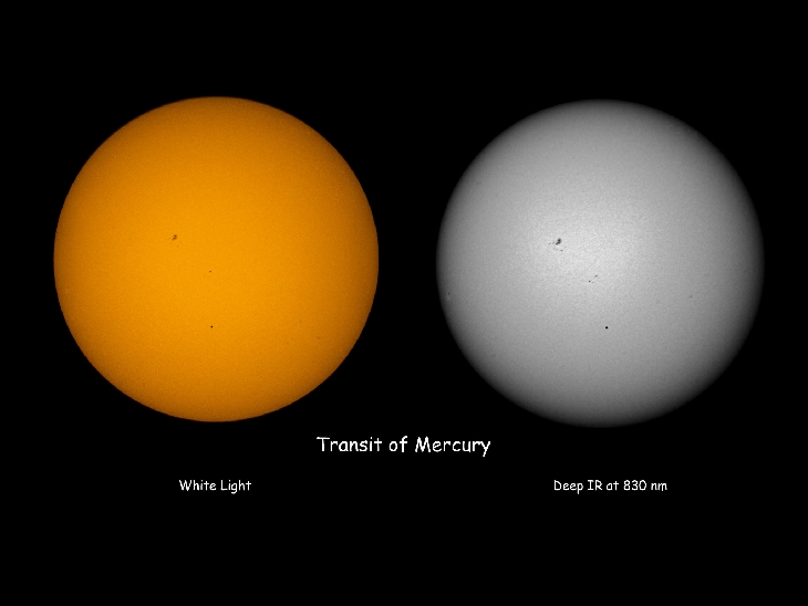 Mercury transit images in visible and IR photographed with a Questar Q 3.5. Visible light images acquired with a Nikon D800, 830 nm deep IR with a converted Nikon D700, and 720 nm near IR with a converted Nikon D200. All images converted from RAW. Images show Vis/720nm/830 nm view and the black drop effect on exit in comparison with the 2012 Venus transit.