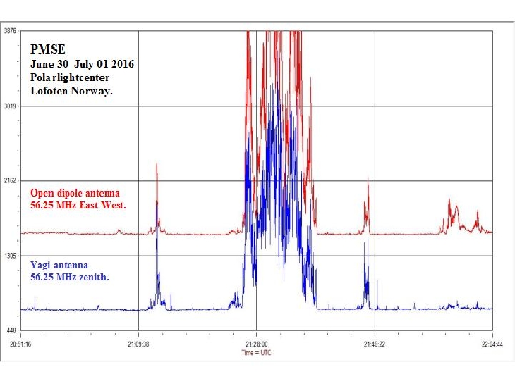 Last night around midnight local time a very strong signal on my vhf radio instruments.Polar Mesospheric Summer Echoes are strange and sometimes present in nights with Noctilucent Clouds.Look at the NLC gallery.