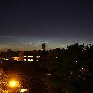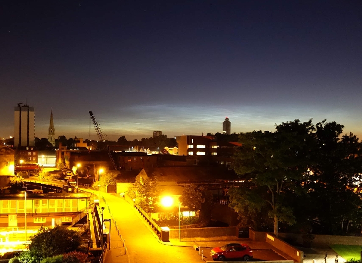 NLC from Brentford, west London, around 02:00 UT on the morning of July 4. I had looked after sunset, as on the previous few nights, but saw nothing. This time I was still up before dawn and saw this — not particularly bright, but the first NLC of the 2016 season for me. The best NLC I have seen from Brentford have usually been in the dawn sky, presumably because the upper atmosphere is colder by then. The tower at right of centre is at the Great West Quarter next to the M4. In the third shot, the top of the Wembley Stadium Arch can be seen low to its right in the distance.
