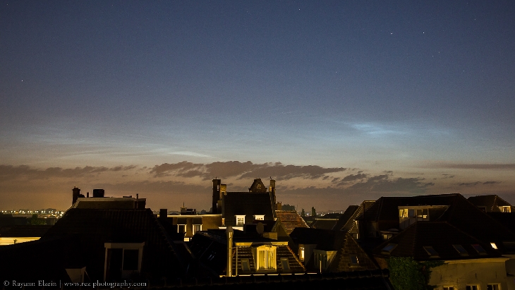 The evening was very clouded so there was no chance to see NLC. However I was hoping for the sky to clear up before sunrise, so I set up my alarm at 3:15 AM. After swearing against it a couple of times, I stood up and looked through my living room window, which faces north. Clear sky, and the beginning of an NLC display!