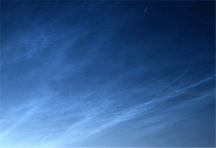 In very transparent skies noctilucent clouds appeared quite bright above the eastern horizon. During the first series of images I discovered that the ISS was approaching that area. Although I had mounted a fish-eye lense on the camera, the next series of pictures were able to catch the ISS clearly. Each image is exposed 2 seconds, ISO=200, f=5.6, 10-22 mm lense zoomed in to 22 mm. The ISS passed almost ahead over the Netherlands at its 25544th pass. For me it was an unexpected opportunity to combine both things. Noctilucent clouds have been observed and imaged from the ISS in beautiful way, but now they are combined together from another perspective, very down to Earth. To create a better view of the ISS, the animation is a part of the original wider view of the sky and is also enhanced in contrast a bit. Camera Canon 20D.