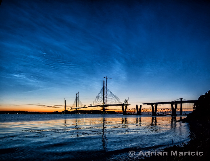 A final Pano of the New Forth Crossing under the electric blue light of Noctlucent clouds. I love the reflections and the liquid metallic appearance of the waves.