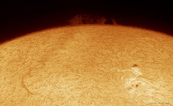 The large filament visible over the last week has finally reached the limb. Close-by there is also the AR2585 group with low activity. 115mm F/7 Refractor, Quark chromosphere, ASI174MM. Poor seeing.