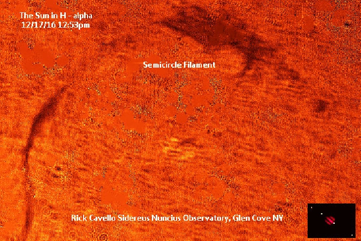 There is a massive filament in the shape of a semicircle that is estimated to be approximately 290,000 miles about a third of the diameter of the Sun, if streched in a straight line. More interesting is the thickness of top of the filament's semicircle. estimated to be about 4+ earth diameters, at its thickest or 35,000 miles