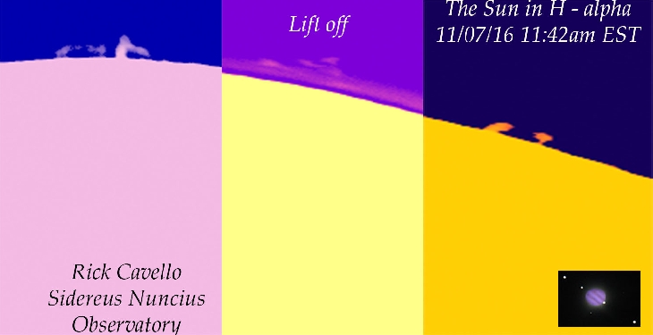 While the Sun was relatively quiet, i was able to get a few prominences on the limb with one actually lifting off. Unfortunately, because of different densities in the proms, I had to edit them separately so as to maximize each visual. coronado 60 w/Skyris 132m