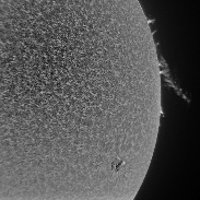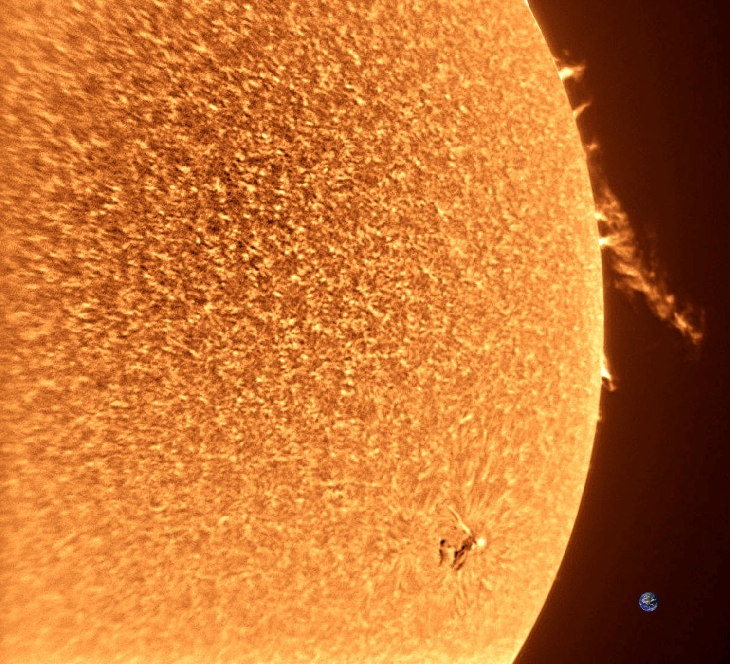 We have very poor seeing today in Southern Arizona, but I had to get a shot of this prominence on the Western limb. I used my 40mm PST, a 1.5X Barlow and a DMK41 camera. The Earth scale may be a little large. The prominence does extend out 50,000 miles or greater.