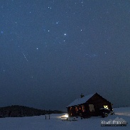 Last night I stayed at a cabin in the Bighorn Mountains of Wyoming to try photographing the Quadrantid meteor shower. The temperature dropped to -15°F and the clouds cleared up a bit before midnight. But then snow showers moved in later on. I only captured one meteor shortly before 3AM that was bright enough to shine through the cloud cover.