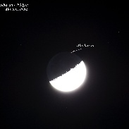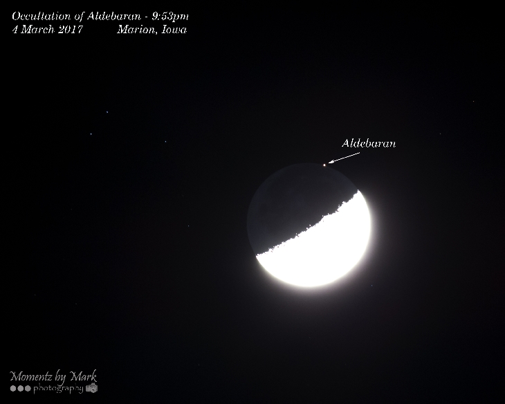 Aldebaran slipped behind the Moon's limb at 9:53pm tonight as seen from my location in Marion, Iowa. Gusty winds prevented me from imaging with my larger telescope. As such, sitting outside with my spotting scope was the best I could do. This image shows Aldebaran sitting on the Moon's limb just 15 seconds before disappearance.