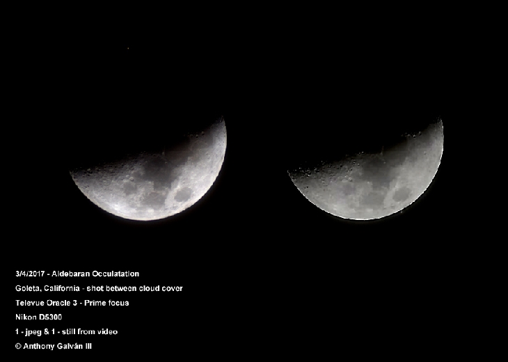 Aldebaran was occulted by the moon under cloudy skys. Seeing was difficult. I was able to see the star and took a still. Mid-way into the passage the clouds cleared a bit so I shot the exit in video and grabbed a frame to make the composite