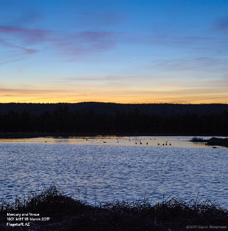 Venus is rapidly falling lower in the sky prior to inferior conjunction later this month while Mercury is slowly rising in the evening sky each evening. Last night, the two planets made their closest approach and were side-by-side in the western twilight.