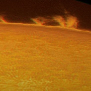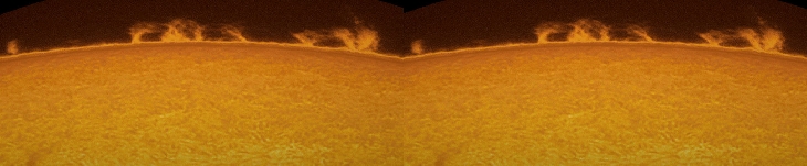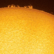 My first image in Jerusalem with the following equipment : Star Adventurer on tripod, PST, Barlow 2x Coronado + Barlow 1.6x AC555 at end of the camera tube, ASI174MM. 60s, 16b, 1024x768 windowed capture with FireCapture. Settings : Gain 230, Exp 3 ms, SER. Processing 1) Astro Image 3.0 for LRD : Curve Width 0.55, iterations 20. 2) RegiStax6 for special gamma curve enhancing prominences. 3) GIMP 2.9 for colorization using Map from another (previous) image. 3D images are realized with Pover-Ray according to this page protocol http://sweiller.free.fr/MoonColor3D/POV-RAy3D.htm .