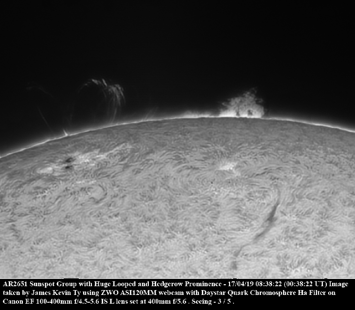 The sky this morning is partly cloudy and I had a hard time imaging. As i concentrated on AR2651 Sunspot Group development, there is a large hedgerow prominence just above the NE limb. As i was compositing, I saw a faint large ring just beside the limb where AR2651 is located and I turn up exposure and behold! A huge looped prominence with the shape of a half heart emerging from the limb! I had to readjust camera position so that I can squeeze both prominences as well as AR2651 Sunspot Group and a large dark filament in one frame as too many clouds for me to take the risk to individually image all.