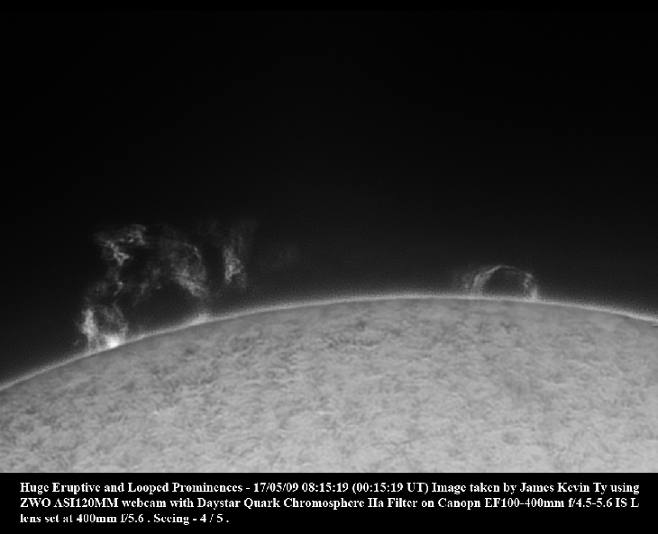 The sky this morning is slightly hazy but seeing condition is very good. There are 2 huge eruptive and looped prominence visible in the NE limb! Aside from this, the Sun activity is all but quiet specially remnant of AR2655 Sunspot Group. Image taken using ZWO ASI120MM webcam with Daystar Quark Chromosphere Ha Filter on Canon EF100-400mm f/4.5-5.6 IS L lens set at 400mm f/5.6 . Seeing - 4/5.