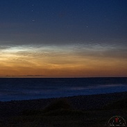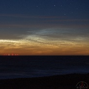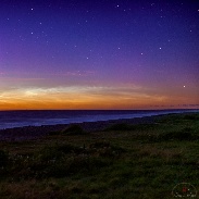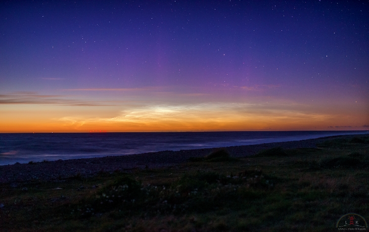 We could only see the bright noctilucent clouds which lasted for about 3 hours through midnight. When I reviewed the ~3000 images I had taken, I saw the purple aurora above the nlcs. It was probably too weak to be seen in the midnight twilight but strong enough for the camera to capture some of its color. We didn't notice a thing with our bare eyes.