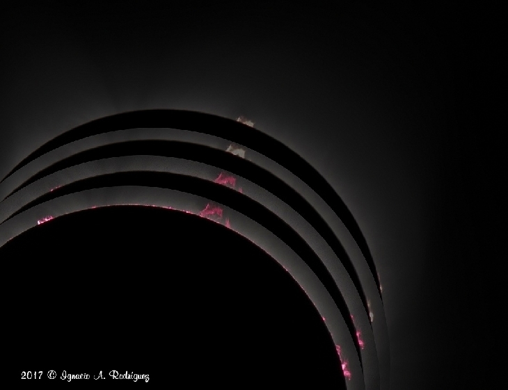 Four pictures showing emerging prominences as the moon travel east. Images 1 and 4 separated by 120 seconds.