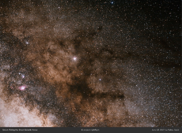In June 2017 the famous dark nebula near the Milky Way's center had a rider. In the image, the bright planet Saturn is seen horseback-riding on the nape of the neck of the silhouetted horse. It was shot in June 2017, when Saturn passed through Ophiuchus. The prancing horse can only be seen from very dark places - any amount of light pollution or moonlight will obscure this large region of dust. Haze or other moisture in the atmosphere will also prevent it from being visible to the human eye.