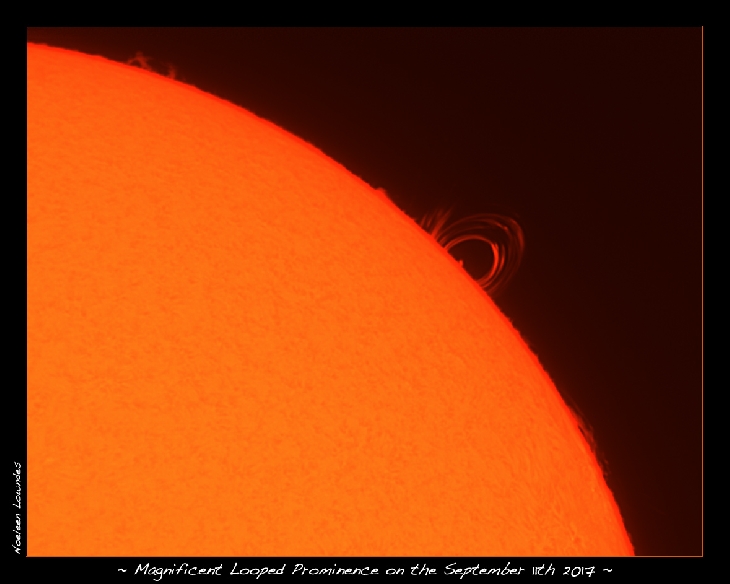 What a stunning surprise to see this magnificent looped prominence on the western limb on the Sun today from AR2673. I watched and photographed it for hours while it pulsated into delicate large arcs…at one stage, I though it was going to detach but then the two sides of plasma meet again and formed another beautiful arc, what an incredible display to witness! This image is taken with a ZWO ASI 120 Mc-S CCD camera with a 3x Barlow lens attached to a Lunt 80mm solar telescope. The AVI movie file was imported into Registak6 for stacking, there was next to no processing, basically, this is the way it come down from the Sun, it was just awesome!!!